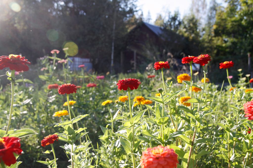 Pääkukkamme on tsinnia, jonka maljakkokestävyys ja monikäyttöisyys ovat omaa luokkaansa. Lisäksi viljelemme mm. upeita leikkokäyttöön jalostettuja daalioita, leijonankitoja, kesäpäivänhattuja, ikiviuhkoja, tuoksuherneitä, koristeheiniä ja paljon muuta. Kukkamaan pinta-ala on pieni, mutta valikoima on silti monipuolinen.