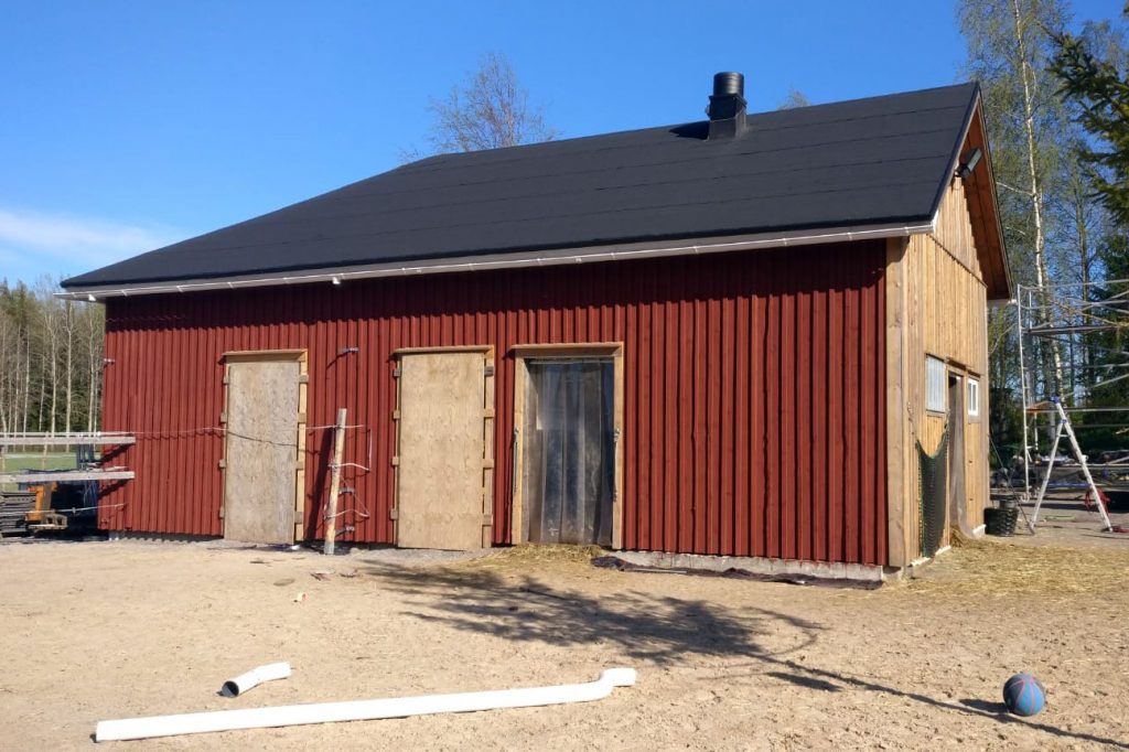 Kolmantena kesänä oli vihdoin remonttimme edennyt siihen pisteeseen, että oli aika maalata ulkoseiniä. No: oikeastaan maalaukseen olisi ollut mahdollisuus jo aiemminkin, mutta viime kesä keskityttiin maansiirtotöihin ja missään välissä ei ollut oikein sopivaa hetkeä. Sitten tulikin jo syksy sateineen. Ehkä ihan hyvä, että tallin laudat ehtivät kuivua pystyssä ja hakeutua omiin muotoihinsa, näin maali ei ala repsottaa saumoista niin pahasti puun eläessä.