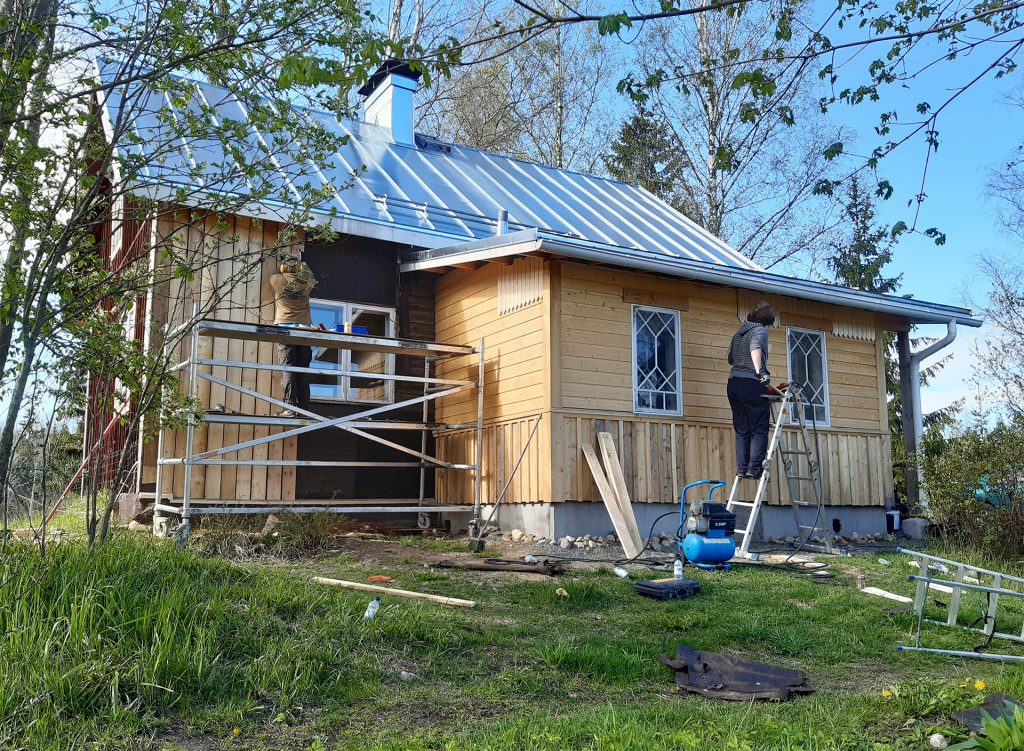 Koronakevään rajoitusten hiukan hellitettyä olimme voineet kutsua veljemme (2 kpl – yksi molemmilla) maalaustalkoisiin. Ponnistuksen ajankohdaksi valikoitui helatorstain yhteydessä oleva pitkä viikonloppu, jotta aikaa olisi enemmän kuin kaksi päivää. Ennen maalausta piti vielä saada tehtyä talon eteläseinän laudoitus, joka oli ehdottomasti uusimisen tarpeessa, sekä askarrella kuistin koristelaudoitus loppuun. Näissä hommissa meinasi allekirjoittaneella hiukan hermot pettää, kun maalausstressi nosti jo päätään ja kello tikitti.